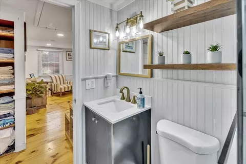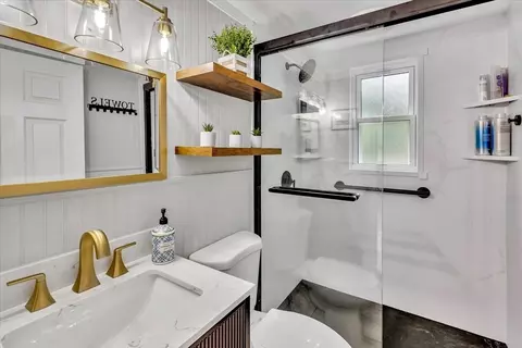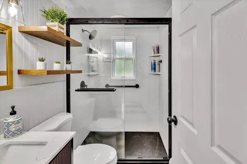 | Bathroom 1 | Bathroom - Full, Bathroom - Tiled With Shower Stall, Flooring - Laminate, Countertops - Stone/Granite/Solid, Countertops - Upgraded, Recessed Lighting, Remodeled, Wainscoting, Beadboard, Crown Molding |