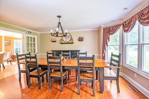 | Dining Room | Flooring - Hardwood, Window(s) - Bay/Bow/Box, French Doors, Chair Rail, Crown Molding |