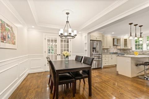 | Dining Room | First, Flooring - Hardwood, French Doors, Open Floorplan, Recessed Lighting, Remodeled, Wainscoting, Crown Molding |