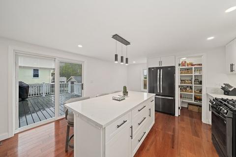 | Kitchen | Flooring - Hardwood, Pantry, Countertops - Stone/Granite/Solid, Kitchen Island, Breakfast Bar / Nook, Deck - Exterior, Open Floorplan, Recessed Lighting, Slider, Stainless Steel Appliances, Wine Chiller, Gas Stove |